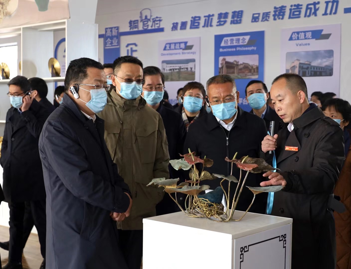 1月12日下午,中共銅陵市委十屆十四次全體(擴(kuò)大)會(huì)議期間,市委書記丁純,市委副書記、市長(zhǎng)胡啟生及各市直部門、開發(fā)園區(qū)和縣區(qū)主要負(fù)責(zé)人等近百人,現(xiàn)場(chǎng)觀摩銅官府銅藝產(chǎn)業(yè)園。全體委員還集中參觀了全國(guó)景泰藍(lán)職業(yè)技能競(jìng)賽參加決賽選手作品以及趙敏的寫真銅藝作品等。